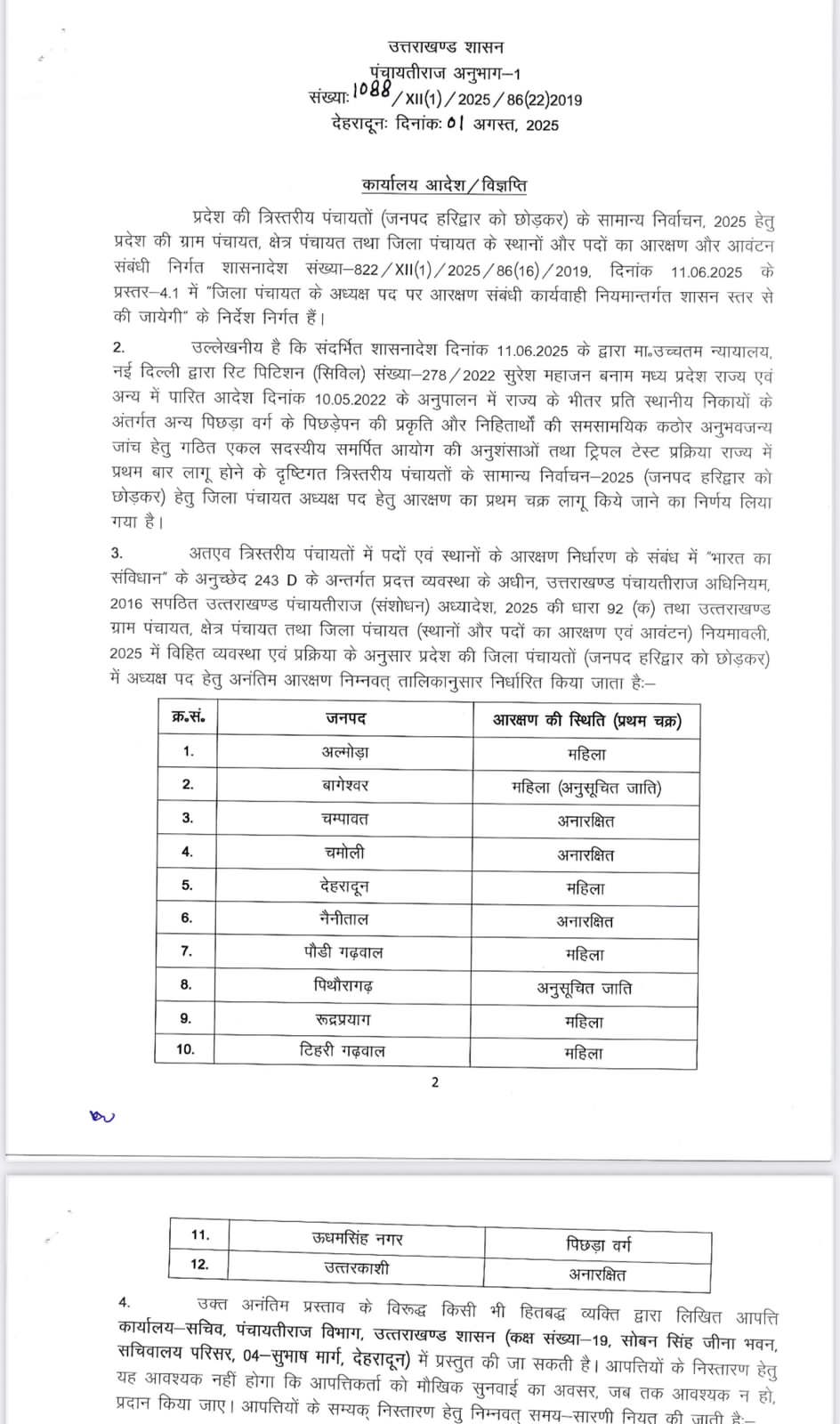 त्रिस्तरीय पंचायत सामान्य निर्वाचन-2025 : जिला पंचायत अध्यक्ष पद हेतु अनंतिम आरक्षण