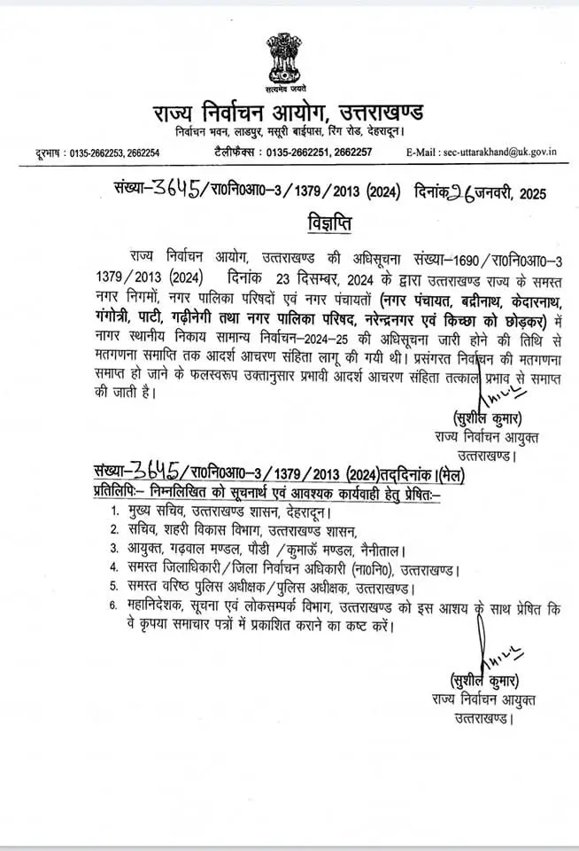 उत्तराखंड में आदर्श आचरण संहिता समाप्त, आदेश जारी... उत्तराखंड। राज्य निर्वाचन आयोग,…