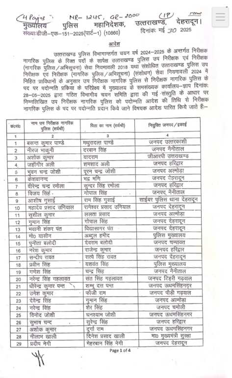 उत्तराखण्ड पुलिस विभागान्तर्गत चयन वर्ष 2024-2025 के अन्तर्गत निरीक्षक नागरिक पुलिस के रिक्त पदों के सापेक्ष उत्तराखण्ड पुलिस उप निरीक्षक एवं निरीक्षक (नागरिक पुलिस/अभिसूचना) सेवा नियमावली 2018 यथा संशोधित उत्तराखण्ड पुलिस उप निरीक्षक एवं निरीक्षक (नागरिक पुलिस/अभिसूचना) (संशोधन) सेवा नियमावली 2024 में निहित प्राविधानों के अनुसार उप निरीक्षक नागरिक पुलिस से निरीक्षक नागरिक पुलिस के पद पर पदोन्नति प्रकिया के परिप्रेक्ष्य में मुख्यालय के समसंख्यक कार्यालय-ज्ञाप 28-05-2025 द्वारा गठित विभागीय चयन समिति द्वारा की गई संस्तुति के आधार पर निम्नलिखित उप निरीक्षक नागरिक पुलिस को पदोन्नति आदेश की तिथि से निरीक्षक नागरिक पुलिस के पद पर पदोन्नति प्रदान किये जाने विषयक आदेश पारित किये जाते हैं:-